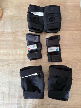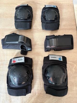 Set de protecciones Oxelo para patinaje, ideal para niños. Incluye rodilleras y muñequeras. - Marca: Oxelo - Diseñadas para patinaje y deportes de deslizamiento. - Cierre ajustable con velcro. - Color: Negro