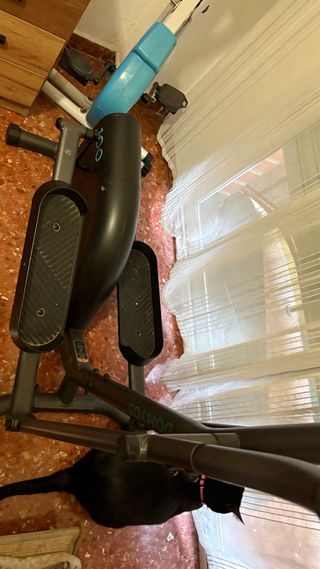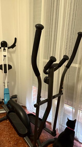 Se venden dos máquinas de ejercicio: una elíptica y una bicicleta estática. - Elíptica de color gris oscuro con pedales negros. - Bicicleta estática blanca y azul con sillín negro.