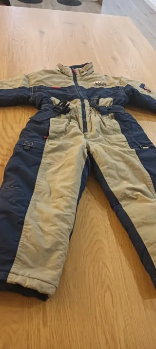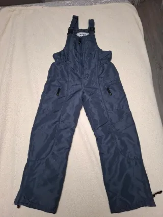 Peto de nieve para niños, ideal para mantenerlos abrigados y secos en la montaña. Diseño bicolor. Talla 116cm( 6/7 años) - Color principal beige con detalles en azul marino. - Cremallera frontal. - Cintura elástica. - Bolsillos laterales.