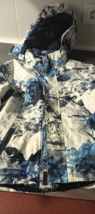 Chaqueta de nieve para niños con un diseño estampado. - Capucha integrada. - Cierre de cremallera frontal. - Estampado de montañas y paisajes.