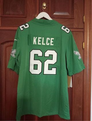 Camiseta de fútbol americano de los Philadelphia Eagles retro, número 62 de Jason Kelce, marca Nike. - Color verde. - Diseño oficial de la NFL.