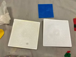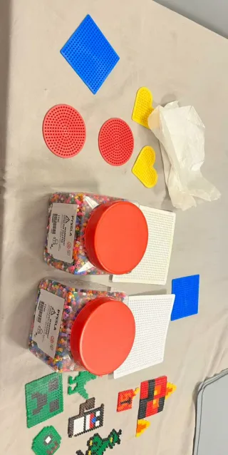 Pyssla 501.285.72 IKEA ( 2 botes nuevos y enteros) , más bases y papeles para planchar. - Dos botes grandes de cuentas Pyssla de colores variados. - Tableros de diferentes formas: cuadrados, redondos y corazones. - Incluye tableros de base blancos y azules.