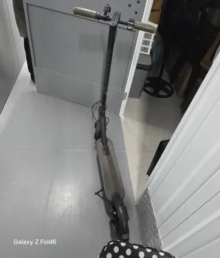 Patinete eléctrico en color negro. Ideal para desplazamientos urbanos. - Manillar con puños texturizados. - Plataforma antideslizante. - Rueda trasera con freno. - Falta arreglar cable delantero - No tiene cargador