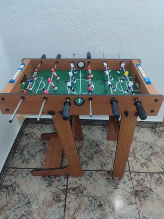 Futbolín de madera con diseño plegable para facilitar su almacenamiento. - Campo de juego verde con marcadores. - Incluye jugadores de diferentes colores. - Barras con mangos para el control.