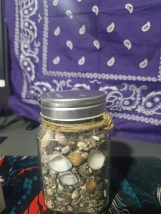 Tarro de cristal lleno de conchas marinas variadas, ideal para decoración o manualidades. - Contiene conchas de diferentes tamaños y formas. - Cierre metálico y detalle de cuerda rústica. - Etiqueta SHELL'S DECO beach collection.