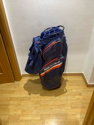 Bolsa de golf de la marca BMW Golfsport en color azul. - Diseño deportivo con detalles en naranja. - Múltiples compartimentos para palos y accesorios. - Asa superior para facilitar el transporte.