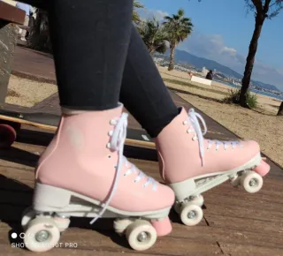 Patines artísticos 4 ruedas de color rosa, talla 40. - Diseño de caña alta. - Cierre con cordones blancos. - Ruedas blancas.