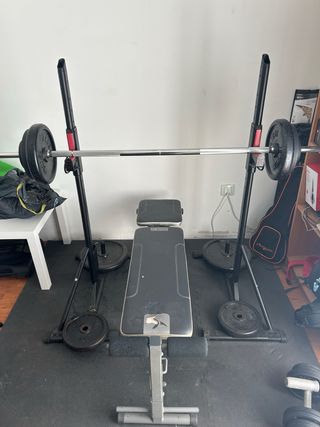Banco de ejercicios BH Fitness 500, ideal para entrenamientos en casa. - Estructura metálica. - Tapicería acolchada. - Soporte para piernas. También, se vende 2 mancuernas , con 6 discos de 2 kg y una barra grande con 2 discos de 10 kg, mas 2 discos de 5 kg.