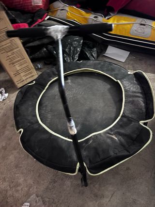 Trampolín tipo colchoneta para ejercicio y fitness. - Estructura negra. - Borde decorativo. - Patas de soporte. Le faltan el tornillo del mango y del mástil por eso el celo, si encuentras uno que le sirva se puede usar, también se puede quitar el mango También cambio por chaleco salvavidas talla S o 40-60kg