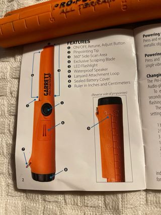Detector de metales Garrett Pro-Pointer AT, ideal para todo terreno. Incluye manual de propietario. - Color naranja brillante. - Diseño compacto y portátil. - Escala de medición en el cuerpo del detector. -Tierra y Agua