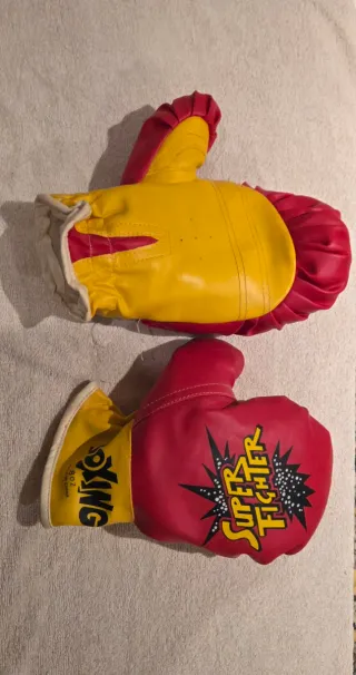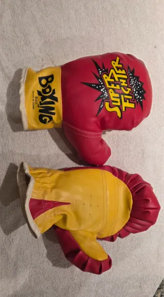 Par de guantes de boxeo Super Fighter de 8 oz. - Color rojo y amarillo. - Diseño con estampado Super Fighter en uno de los guantes. - Etiqueta Boxing 8oz visible en el otro guante.