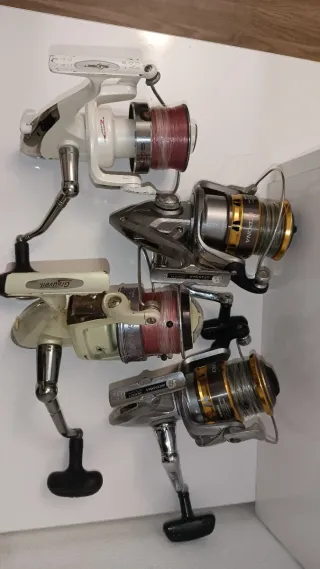 Conjunto de carretes y Cañas de pesca de diferentes marcas y modelos. Incluye carretes Shimano Sedona y Grauvell. Y Cañas 4.20cm en las anillas están algunas oxido en la foto lo verás 3 Pinchos de 70.cm - Carretes de pesca. - Marcas: Shimano, Grauvell. - Modelos: Sedona.