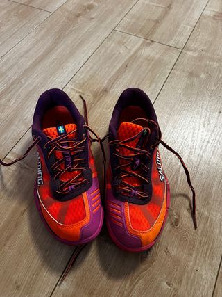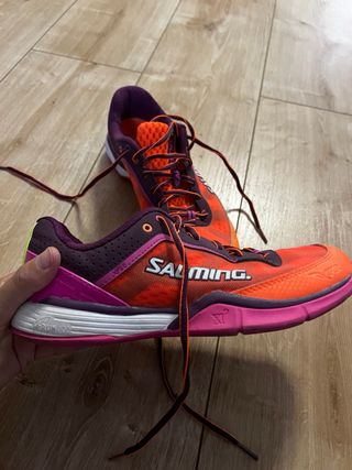 Zapatillas deportivas Salming viper en llamativos colores naranja y morado. - Diseño deportivo. - Cordones naranjas. - Detalle de logo en los laterales. solo se han usado una vez (precio nuevas en tienda web 150) zapatillas ideales para deportes de cancha como balonmano.