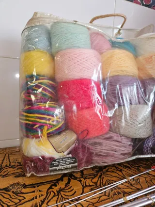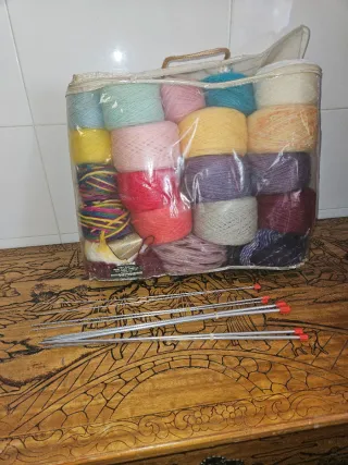 Conjunto de lanas de diferentes colores y texturas, ideal para tus proyectos de tejido. Incluye un juego de agujas de tejer. - Variedad de colores: azul claro, rosa, amarillo, naranja, morado, beige, rojo, verde y multicolor. - Lanas de diferentes grosores y acabados. - Juego de agujas de tejer metálicas con puntas rojas.
