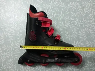 Patines en línea negros y rojos, modelo California Pro TXT JR. Perfectos para iniciarse en el patinaje. Protecciones de codos, rodillas y manos. Para niño/a bota de 25 cm de largo.