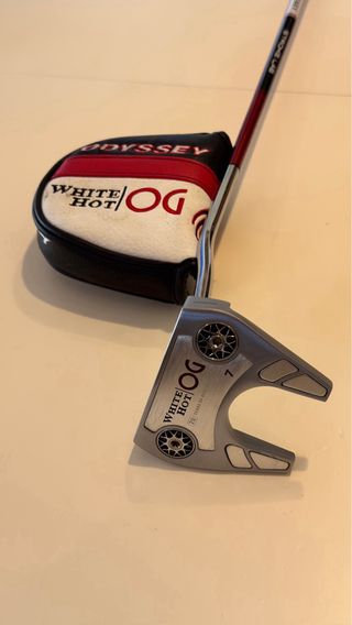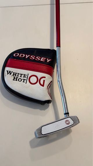 Putter Odyssey White Hot OG 7. Incluye funda. - Modelo: White Hot OG 7 - Marca: Odyssey - Color del palo: Plateado y rojo - Color de la funda: Negro, blanco y rojo