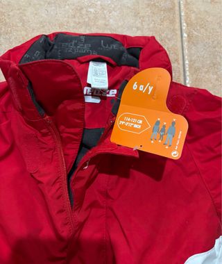 Mono de esquí para niño o niña en color rojo, talla 6A (114/121 cm). - NUEVO (1 solo uso) - Diseño de una sola pieza. - Cintura ajustable. - Cuello alto. - Impermeable - Con capucga capucha