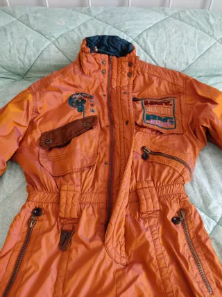Mono de esquí de color salmon talla 42/44 medidas hombro a hombro 53 largo de hombro a pie 1’50 Cuenta con capucha y no tiene cinturon - Capucha con pelo sintético. - Cierre de cremallera frontal. - Puños elásticos en mangas y piernas. - Tiene unas pequeñas manchas como de grasa del telesilla pero que casi no se notan.