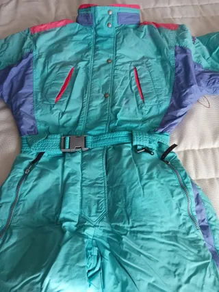 Auténtico de los años 80/90, con diseño retro color block en tonos pastel (azul claro y gris perla) ✨. Pieza original hecha en Francia, con estilo único y mucho carácter. Ajuste real: equivale a una 38 actual 👗 (yo suelo usar 38 y me queda bien; de tronco sobra ligeramente, mido 1,57 m). 📏 Medidas aproximadas: Largo total: 1,58 m Cintura con goma elástica: 37–43 cm Manga continua (sin costura definida) 🧼 Estado: muy bueno, solo 2–3 marquitas mínimas visibles que no afectan estética ni funcionamiento. Cremalleras de bajos y gomas interiores en perfecto estado. Perfecto para esquiar, fiestas retro o looks après-ski ❄️.