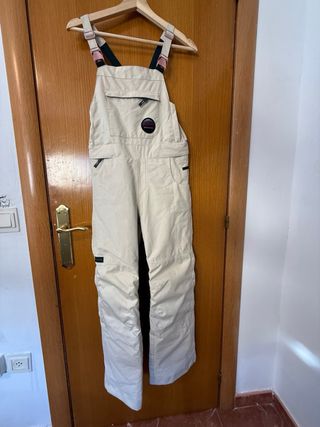 Mono de snowboard The North Face para mujer, con un diseño moderno y funcional. Precio nuevo 324€. Usado solo una vez, como nuevo excepto por alguna pequeña mancha (ver fotos). - Color principal blanco roto con detalles en amarillo y negro. - Bolsillos frontales y laterales. - Tirantes ajustables.