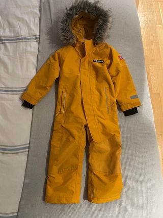 Mono de nieve de la marca Trollkids en color amarillo. Talla 4-6 años. En perfecto estado, sin ningun roce. - Capucha con pelo sintético. - Cierre frontal con cremallera. - Bolsillos en la parte delantera. - Puños elásticos en mangas y piernas.