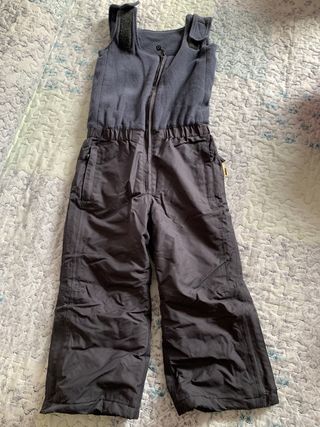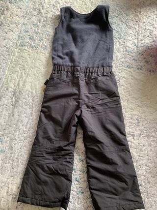 Mono de esquí de color gris oscuro, ideal para los días fríos. - Parte superior de forro polar. - Pantalón impermeable. - Cremallera frontal. - Tirantes ajustables con velcro.