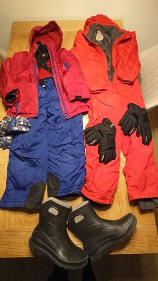 Mono rojo T-10, conjunto pantalón+chaqueta para 128cm (altura), botas tipo descanso T38/39 y 3 pares de guantes (2 para conjunto 128cm y otro par negro para el de T-10). Poco uso. Pack todo 45€ Se puede vender por separado