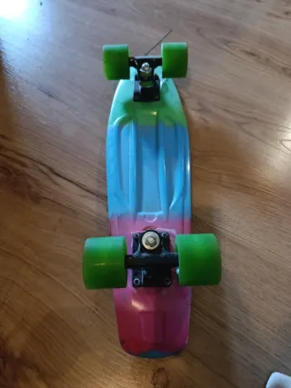Monopatín con un diseño degradado de colores vibrantes, que va del naranja al morado y azul. - Ruedas de color verde. - Superficie con relieve para un mejor agarre.