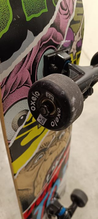Monopatín Oxelo de Decathlon con un diseño llamativo y colorido. - Gráficos originales. - Ruedas y ejes en buen estado. - Parte superior se ha levantado por algunas zonas, por no utilizarlo