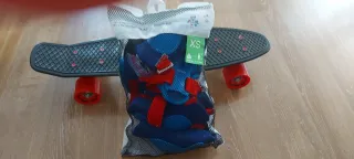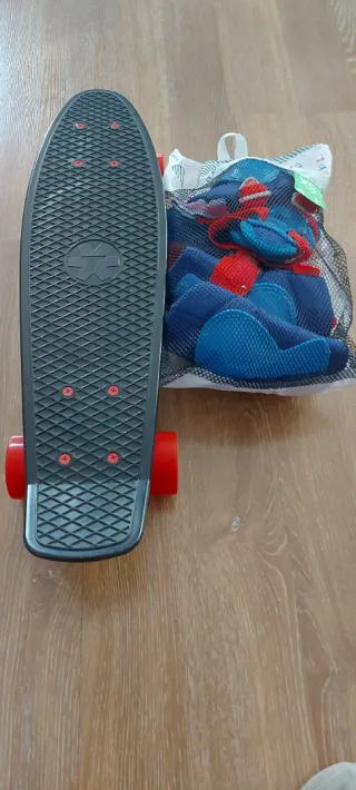 Monopatín infantil de color negro con ruedas rojas. Esta nuevo tanto el monopatín como las protecciones, lo probó en la terraza de casa y le dio miedo y no se ha utilizado. Pongo la parte de abajo para que se vea que esta nuevo y también las protecciones. Son 6: Rodillas, codos y manos. El colorazul y rojo