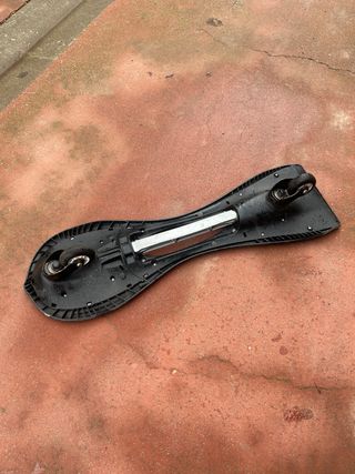 Monopatín de dos ruedas con diseño dividido. - Dos plataformas conectadas por un eje. - Ruedas giratorias en cada plataforma.