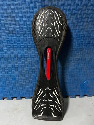 Monopatín tipo waveboard de la marca Oxelo, con un diseño moderno y llamativo. Muy poco uso y en condiciones perfectas. - Dos ruedas para deslizarse. - Barra central naranja. - Superficie con estampado morado y negro.