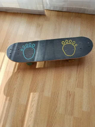 Monopatín con un diseño divertido y llamativo. - Se uso un rato una tarde y ya, puede pasar por nuevo. - Tabla negra con huellas de patitas en azul y amarillo. - Ruedas de colores: dos azules y dos amarillas. Lleva otros agujeros para desplazar los ejes más alante y darle + altura en el caso que el niño/a crezca y le duró al Deporte, que es no es mi caso.