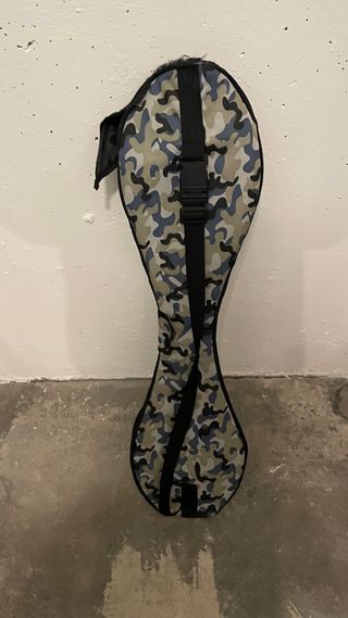 Monopatín de dos ruedas con funda con diseño de camuflaje. - Diseño curvo y dividido en dos plataformas. - Superticie antideslizante en las plataformas. - Funda con asa regulable.