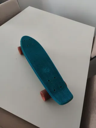 Monopatín de estilo retro con una base azul y ruedas naranjas. cruiserboard para adultos y pequeños. usado pero no hay daños graves. - Base con textura antideslizante. - Ruedas de color naranja. - Diseño compacto y ligero.
