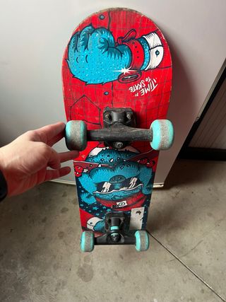 Tabla de Skate / Monopatín / Patín marca Oxelo, con dibujo de lobo en la parte inferior y colores verdes. Tiene claros signos de uso y del paso del tiempo, como desgaste en las puntas de la tabla, marcas en las ruedas y algún arañazo visible en las fotos. También cabe añadir que la lija está algo gastada y sucia de la suela de los zapatos. Ideal para empezar y aprender a montar en skate, ya sea en calle o skatepark 🛹✨ Se aceptan ofertas 💸