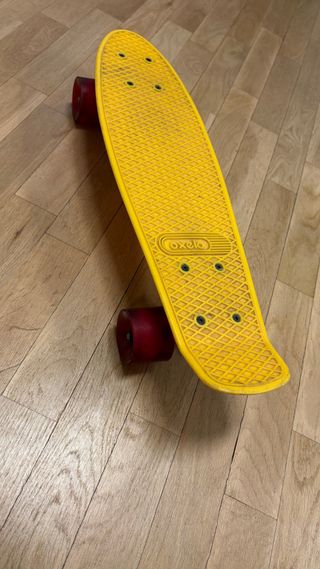 Monopatín de la marca Oxelo en color amarillo. - Diseño clásico. - Ruedas rojas.