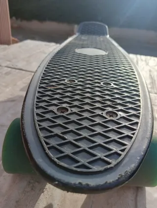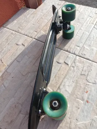 Monopatín de estilo penny board con ruedas verdes. No está usado,tengo 2 unidades . Se venden por separado. - Tabla negra con textura antideslizante. - Ruedas de color verde. - Tornillos azules.