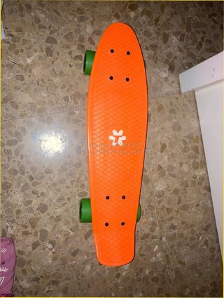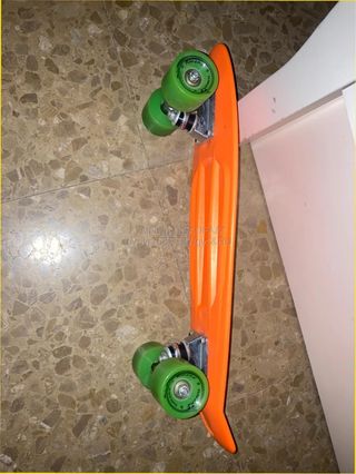 Monopatín tipo Penny de color naranja, en perfecto estado ya que solo ha sido usado una vez. Lo pedí por reyes cuando se puso de moda, me caí el primer día que intenté aprender a usarlo y jamás volví a cogerlo desde entonces. - Ruedas verdes. - Tabla de plástico naranja resistente. - Comprado en El Corte Inglés hace años.