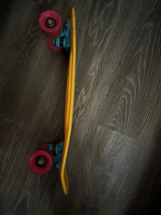 Monopatín tipo penny board de color rosa, con muy poco uso. - Diseño compacto y ligero. - Ruedas de color ámbar. - Superficie antideslizante.