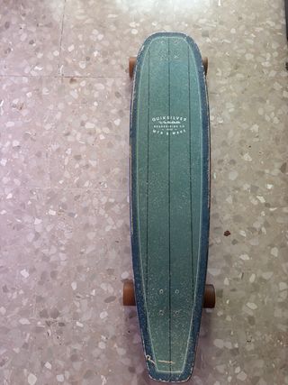 Monopatín Quiksilver con diseño clásico. - Color verde azulado con detalles en azul marino. - Logo de Quiksilver Boardriding Co. - Ruedas de color marrón.