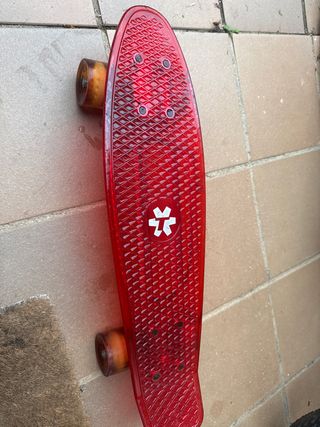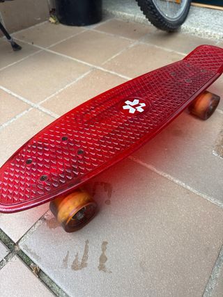 Monopatín de estilo penny board, con un llamativo diseño transparente en color rojo. - Ruedas naranjas translúcidas. - Superficie con relieve antideslizante. - Logo blanco en la parte superior. Se puede hacer la compra en persona.