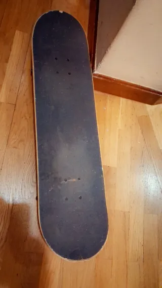 Monopatín para skate, con diseño moderno y llamativo. Ideal para iniciación en el Skate. Atrévete a disfrutarlo! Muy poco uso. Ha estado guardado en trastero. Todas las piezas son originales de la marca. - Tabla con dos tonos en parte inferior : azul claro y azul marino. Lija de la parte superior en condiciones óptimas - Ruedas de color naranja como nuevas - Ejes metálicos.