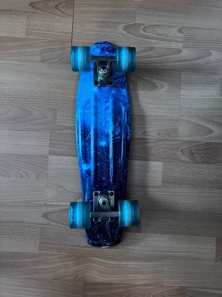Monopatín en buen estado, ideal para principiantes. - Diseño azul con estampado de galaxia. - Ruedas de color azul claro. - Perfecto para divertirse.