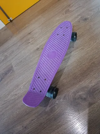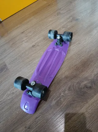 Monopatín de color morado, ideal para desplazarse. - Tabla con textura antideslizante. - Ruedas negras.