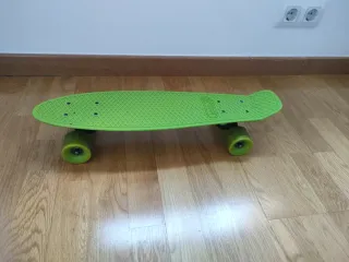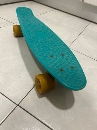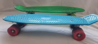 Se venden dos monopatines tipo Penny Board, uno azul y otro verde translúcido. - Se puede vender por separado (10€). - En perfecto estado, sin desgaste. - Medidas entre 55 cm y 58 cm. - Levanta del suelo 9 cm - Monopatín azul con ruedas rojas. - Monopatín verde translúcido con ruedas amarillas. - Diseño clásico de Penny Board.