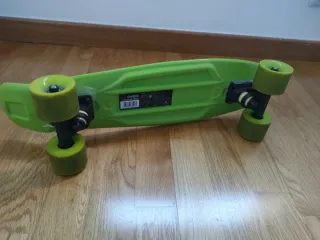 Monopatín tipo cruiser, ideal para desplazamientos urbanos. - Tabla con lija adherida. - Ruedas verdes y negras.