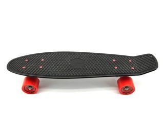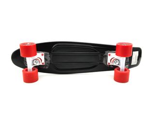 Monopatín clásico de color negro con detalles en rojo. - Tabla de plástico resistente. - Ruedas de poliuretano para un deslizamiento suave. - Ejes metálicos.