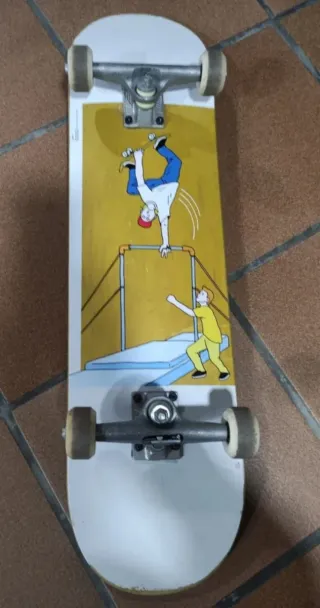 Monopatín para patinar. - Superficie antideslizante. - Diseño clásico. -la parte trasera rasgada y pegatina algo levantada. Pero está perfecto.