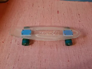 Monopatín junior de la marca Nixor, ideal para los más pequeños. Su diseño transparente le da un toque moderno. - Marca: Nixor - Diseño transparente - Incluye luces En muy buen estado. Medidas: -57 cm de largo. -15 cm de anchura.